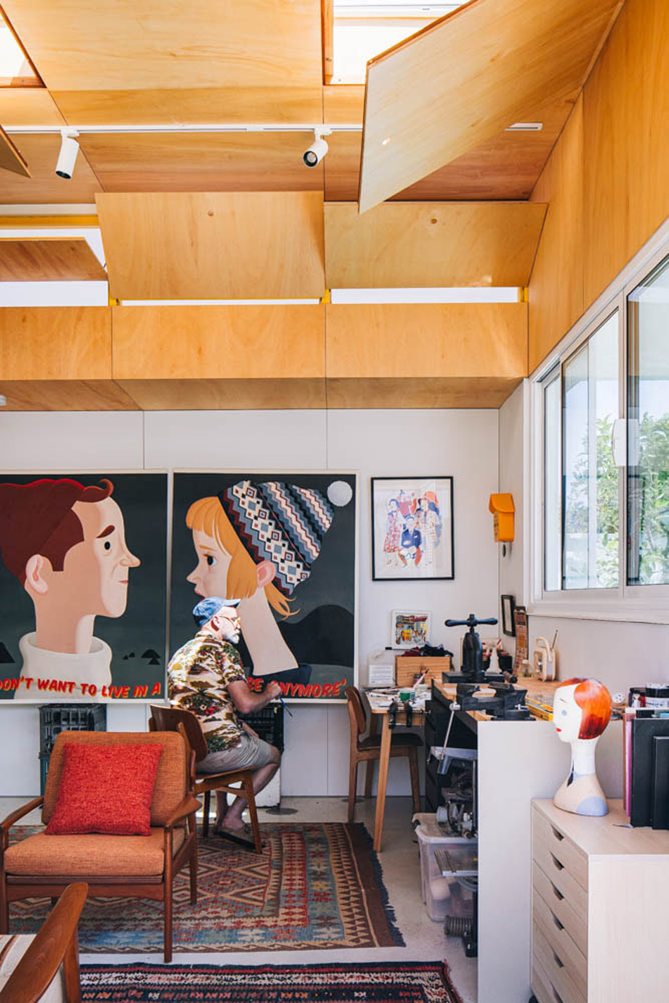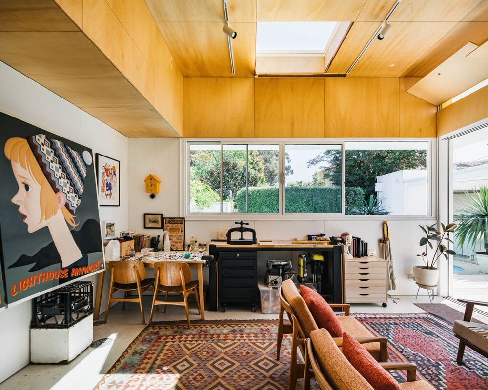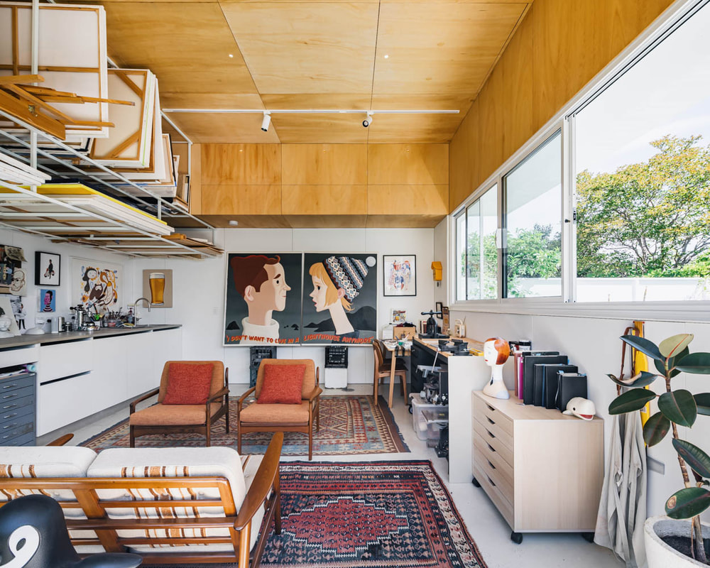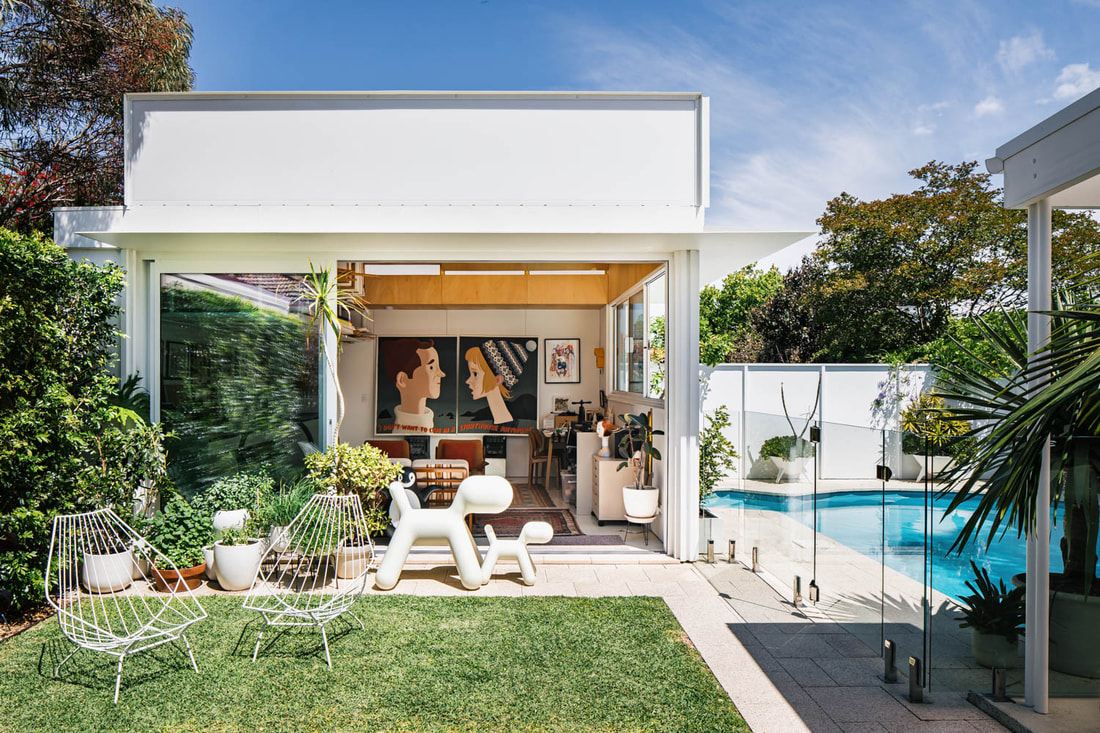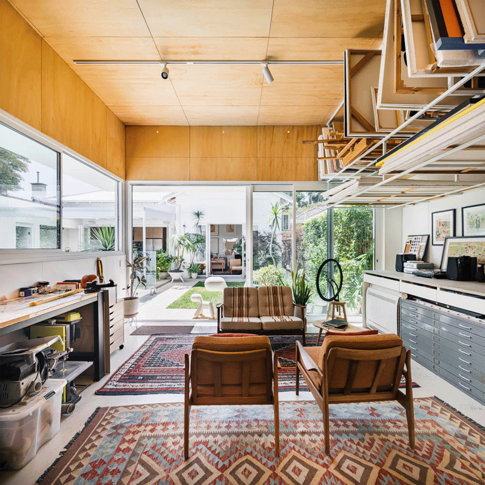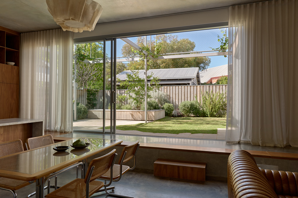 Living spaces are sunken relative to this outdoor room, presenting a level change that doubles as informal seating and dramatised threshold.