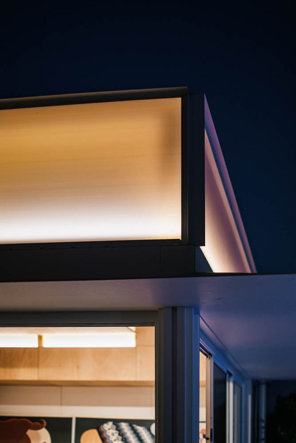 The entire house is contained within a rectangular metal box that has had an outdoor space peeled away from it, leaving only a skeletal outer steel frame and rough-sawn timber clad walls at the threshold with interior space.